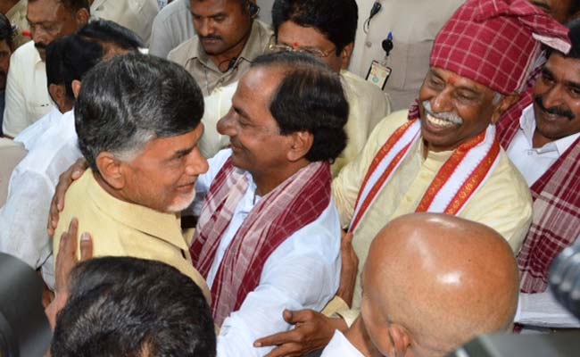 Hyderabad: Chief ministers of Telangana and Andhra Pradesh, who usually miss no opportunity to target each other, on Sunday displayed some bonhomie on coming face to face and hugged each other.